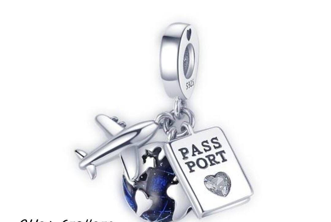 ¿Eres amante de los viajes? entonces le falta este Charm a tu pulsera, hecho en plata 925, con un mundo, un avión y un pasaporte, simplemente hermoso.