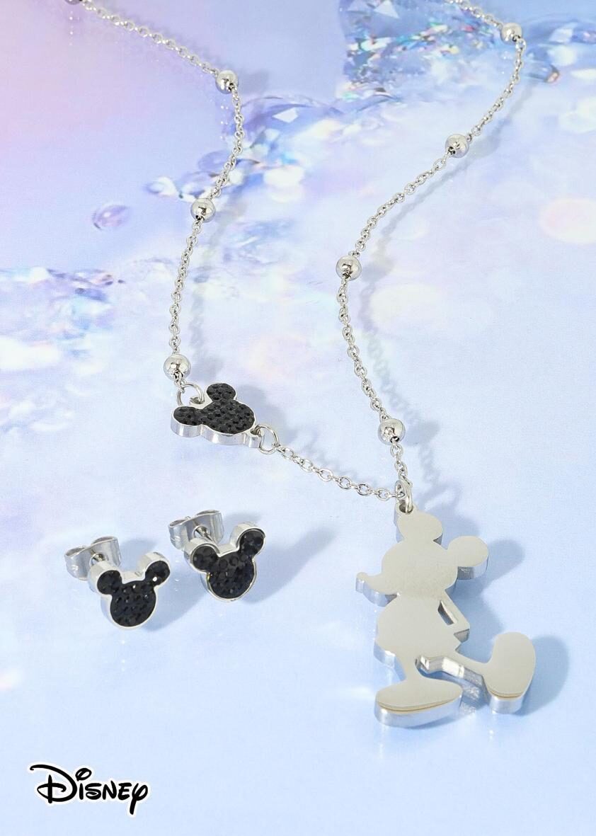 Coordinado color plata hecho en acero con figuras de Mickey Mouse, ¡Hermoso!