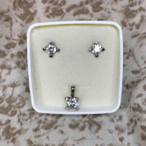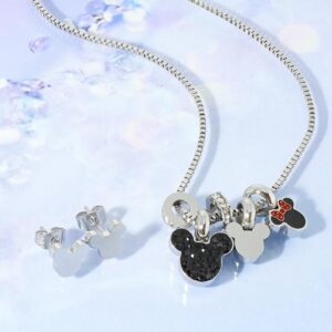 Delicado coordinado de aretes y collar con figuras de Mickey Mouse y cristales.
